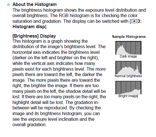 I have never used the RGB histogram. You can use one or the other with the Canon 6D. One or the other. I choose brightness. I am not clear how the colour histogram will help me.
